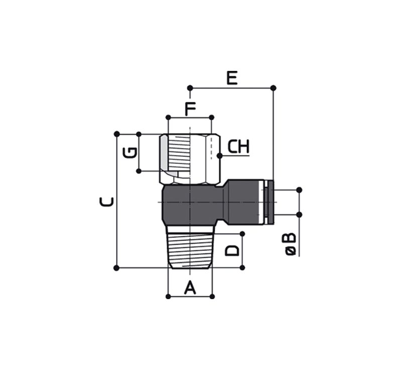 Conexão orientável em L giratória rosca macho BSPT – Fêmea BSP